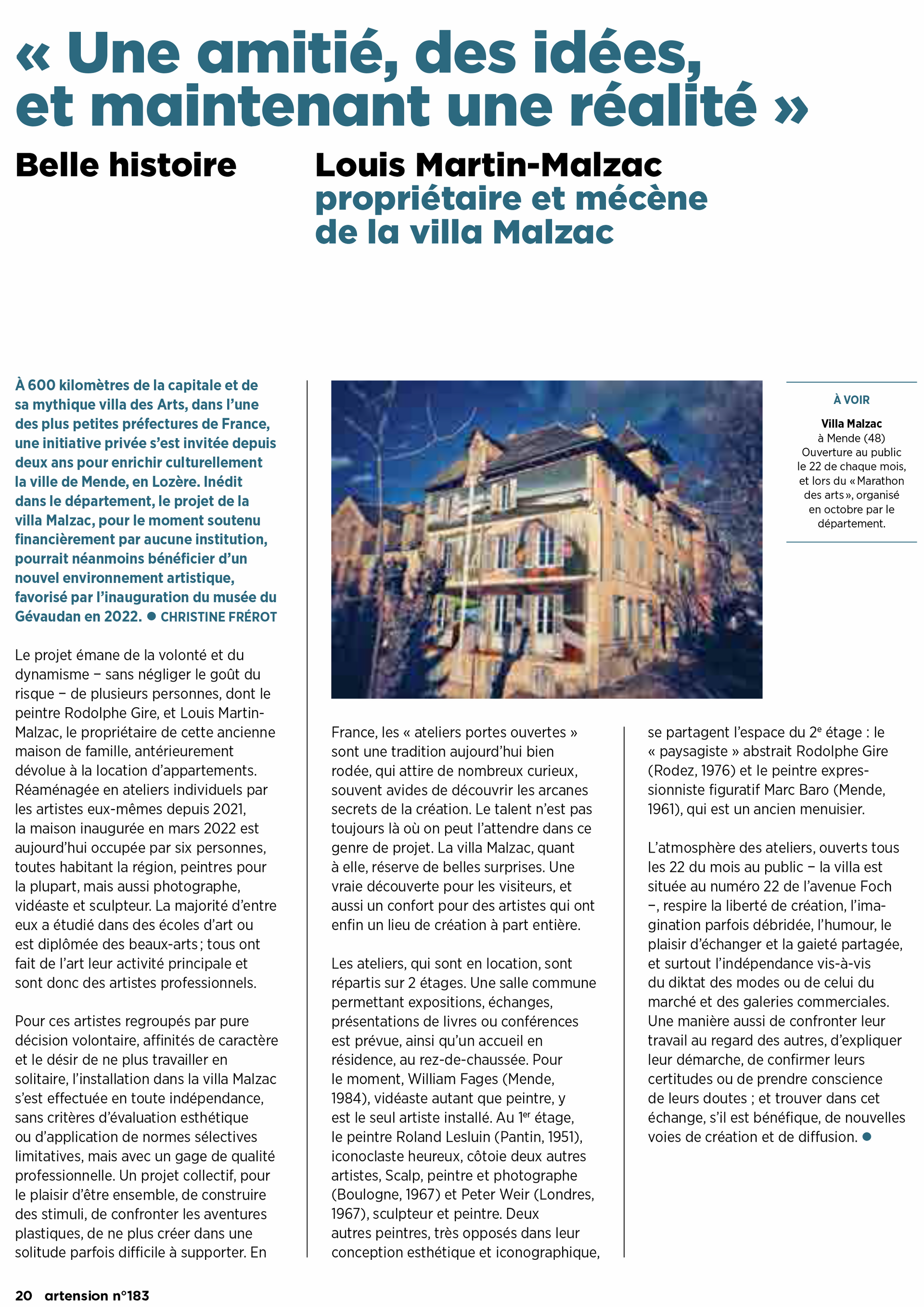 ScALp mène sa vie d'artiste entre la Corse et le continent, "sociétaire' de L'Atelier Galerie à la Villa Malzac à Mende en Lozère. Une initiative privée novatrice visant à enrichir culturellement le territoire, portée par le propriétaire Louis Martin-Malzac et avec la participation de six artistes professionnels, dont des peintres, photographes, vidéastes et sculpteurs. Cette ancienne maison bourgeoise est transformée en ateliers individuels. Les artistes, formés dans des écoles d'art, ont choisi la villa pour échapper à la solitude artistique. Les ateliers, ouverts au public chaque 22 du mois, offrent un espace de création libre, d'imagination débridée et d'échange, éloigné des normes artistiques et commerciales, favorisant la gaieté partagée et l'indépendance artistique.